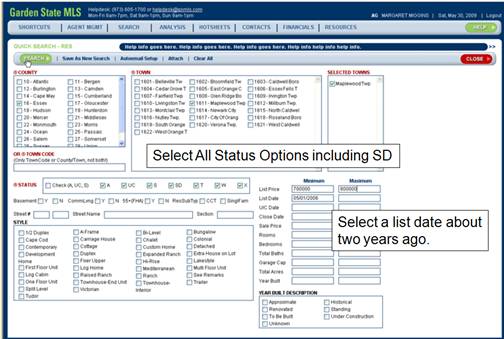 Make sure that all the status options are selected. Then place a more recent date in the “Listing Date” entry field. The data “01/01/2006” is a good date for 2008 (since only the last two years are used. These options will make sure that all the data that is needed to create the appropriate graphs, is collected.