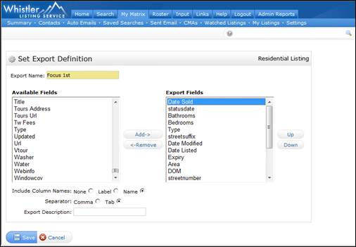 Press the “Add Export” button to create your Export Format. You will see a screen similar to that shown below.
